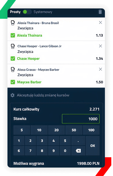 Rejestracja z kodem Fortuny to również dostęp do zakładu bez ryzyka o wartości do 100 PLN. Dzięki nim, możesz obstawiać kupony na gale UFC i innych federacji, a jeśli okażą się przegraną, uzyskasz zwrot całej postawionej stawki w gotówce. Załóż konto z naszym kodem promocyjnym Fortuna, a uzyskasz bonusy o maksymalnej wartości.
